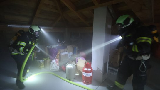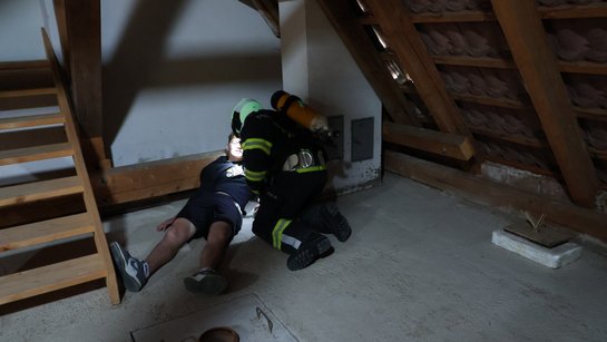 Die Übungsannahme war, dass durch einen Blitzschlag der Dachstuhl eines Nebengebäudes aufgrund der enormen Hitze und Energie in Brand geriet. Die Flammen schlugen teilweise über die Feuermauer auf das angrenzende Wohngebäude über.