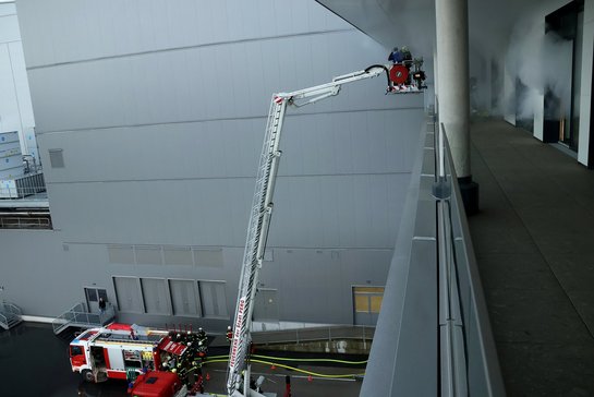 Beim Eintreffen der Einsatzkräfte wurde festgestellt, dass die Stiegenhäuser aufgrund des Stromausfalls verschlossen waren. Daraufhin erfolgte die Rettung des eingeschlossenen Technikers im Hochregallager durch die Höhenrettung der Feuerwehr Arbing in enger Zusammenarbeit mit der Feuerwehr Obernstrass. Der Zugang wurde über die Teleskopmastbühne der Feuerwehr Perg sichergestellt, um eine sichere Rettung von außen zu gewährleisten.