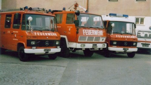 Diese Aufnahmen stammen aus dem Jahr 1987 und zeigen den Fuhrpark: Links: Das Land Rover-Kommandofahrzeug, die 3 Ford Transit und das damals ein Jahr alte KLF, Rechts: Das LFB, das TLF-A 4000 und das ASF