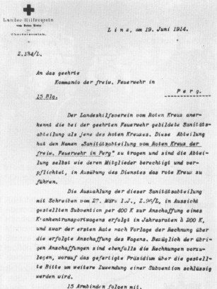 Am 14. Juni 1914 erhielt das Kommando der FF Perg ein Schreiben in welchem es heißt: "Der Landeshilfsverein vom Roten Kreuz anerkennt die bei der geehrten Feuerwehr gebildeten Sanitätsabteilung als jene des Roten Kreuzes. Die Abteilung hat den Namen "Sanitätsabteilung vom Roten Kreuz der freiw. Feuerwehr Perg" zu tragen ... "